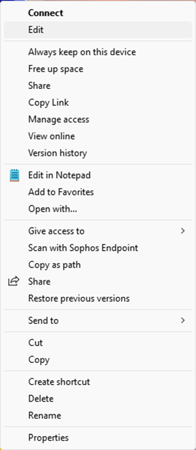To do this you will right-click on the RDP file and select the "Edit" option. (If you are on Windows 11 you will first select the "Show more options" button)