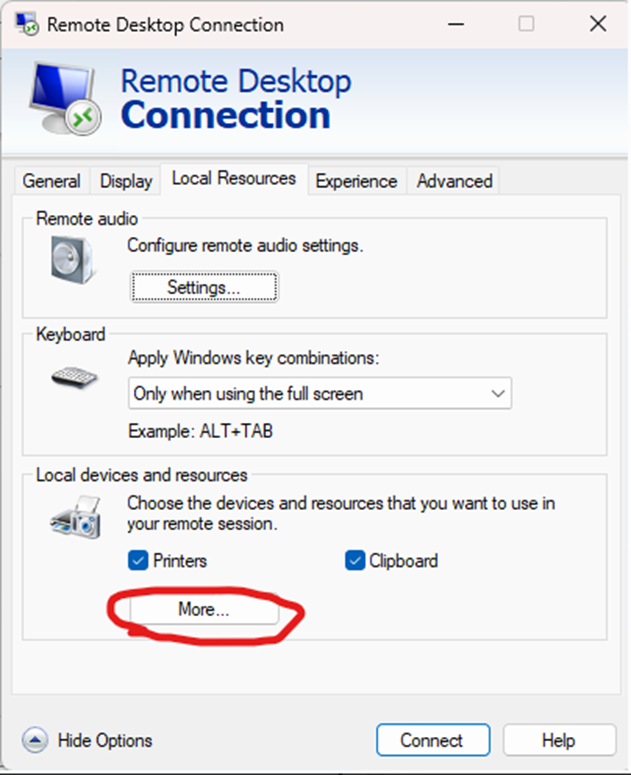 Once the new window opens, you can select the tab that says "Local Resources" and at the bottom there is an option that says "More"