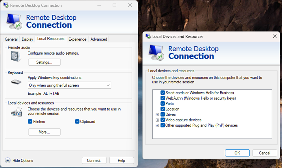 This will show what items are being re-directed over the RDP connection. You can select or de-select any items you wish to use or not use.
