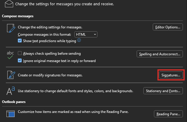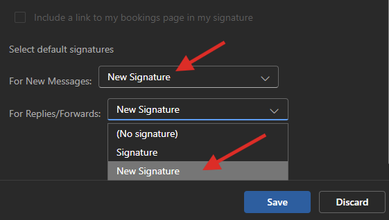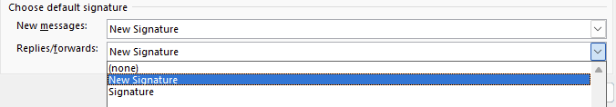 - Click save, scroll down and select the new signature for New Messages and Replies/Forwards