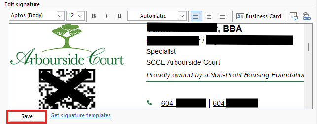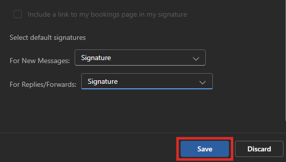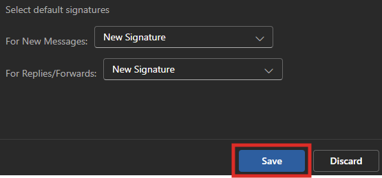 Clicking save here will save the changes made to the new signature but will not set it as the default signature. The screenshot and steps below ensure the new signature is set.
