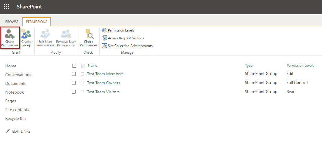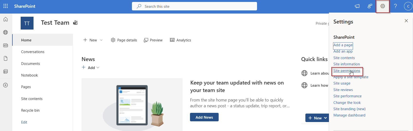 - Click the Settings gear icon in the top-right corner and select Site Permissions.