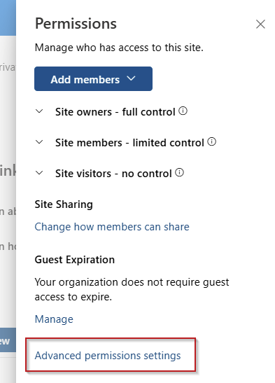 - In the Site Permissions panel, click Advanced permissions settings at the bottom.