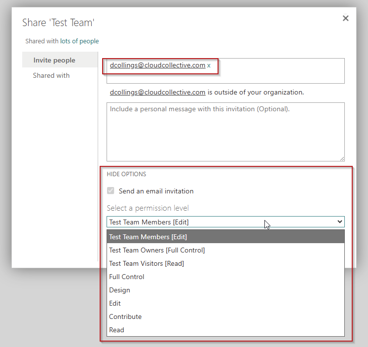 - Enter the user’s email address, select the appropriate permission level (e.g., Read, Edit, Full Control), and click Share.